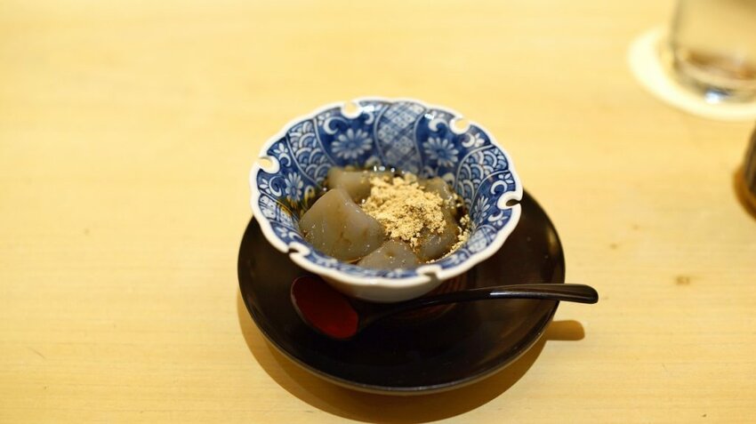 清爽青蔥味增湯下肚,再以熱茶配上黑糖葛切。