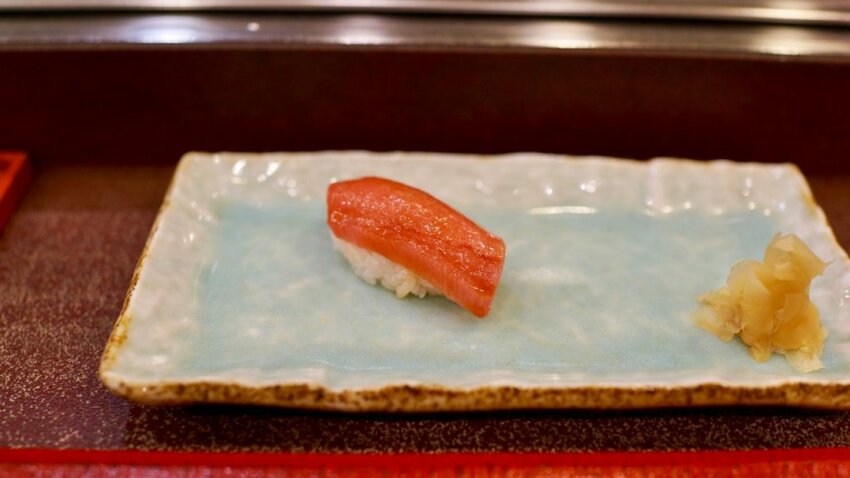 師傅上壽司的順序比較不同於傳統,在簡單的漬物開胃後就是中腹與大腹,接著是真鮪三連發的第三貫漬鮪魚赤身,都是屬於口味重、油脂豐富的魚料,頗出乎意料。
