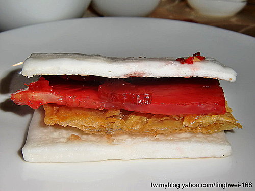 甜甜的火腿肉片加上烤素方與餅皮一起吃