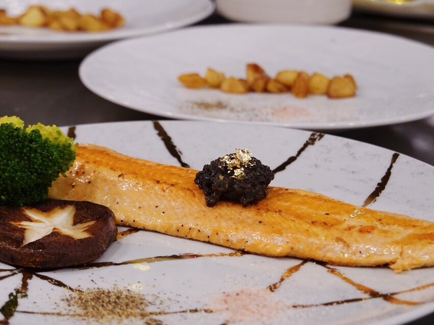 我平常常吃的鮭魚,通常為輪切且烹調方式多以清蒸為主,「江雁塘新時尚鐵板燒」所提供的紅點鮭魚則是長條片狀,色澤較一般鮭魚紅潤,上頭還擺了松露及金箔點綴,增添華麗感。