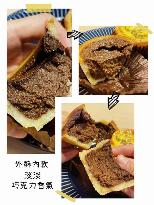 巧克力控的我當然要點一顆巧克力試試,烤過的蛋撻外酥內軟,趁熱吃還蠻好吃的,不過巧克力味偏淡,整體甜度對我而言比較容易膩口(os:我吃的比較清淡)