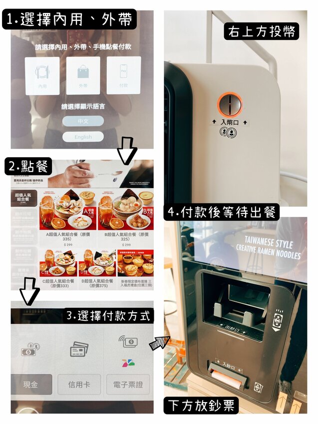 點餐步驟很簡單,手指觸碰螢幕後,選擇:內用或是外帶、點餐、點選付款方式、付錢、單據出來後,等待店員送餐,就大功告成啦!