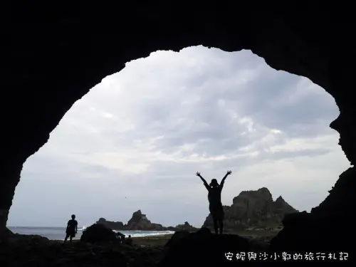 面向大海左側眺望,可見綠島最大的海蝕洞「彎弓洞」,這個海蝕洞目前已被海水穿蝕,往海蝕門演化,是拍攝絕美「藍眼睛」的熱點。