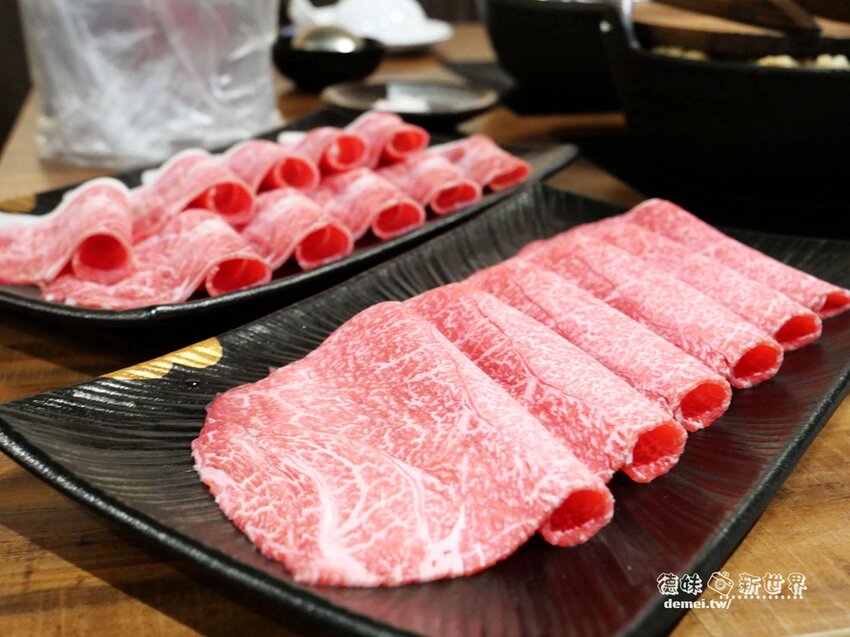 上照油花細緻且分佈漂亮均勻的是日本A5黑毛和牛,軟嫩綿柔很是化口,
