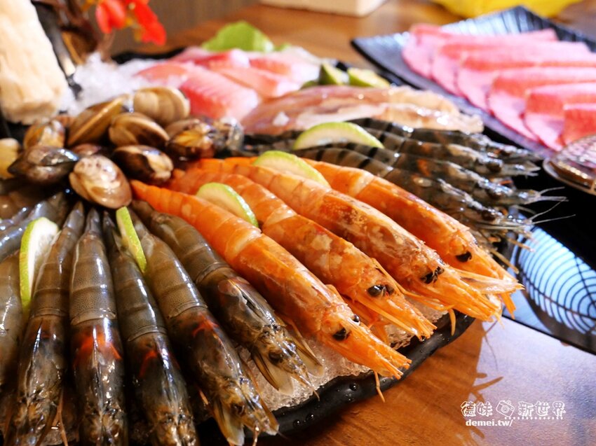 白蝦、草蝦、天使紅蝦、蛤蜊、鯛魚片、扇貝、干貝、小卷、花枝漿,