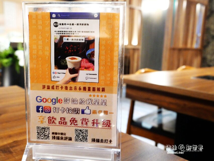 Google評論與臉書打卡按讚(兩者擇一)享飲品免費升級。