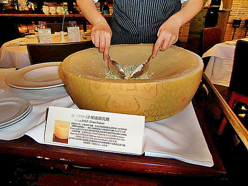 由服務人員先將燉飯倒入大大的「帕達諾乳酪」內拌炒