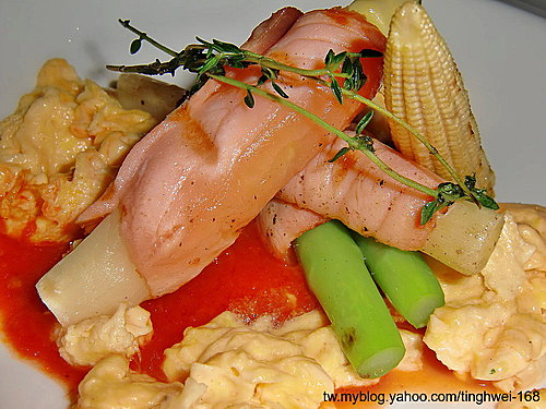 鮭魚片包覆著白蘆筍與綠蘆筍