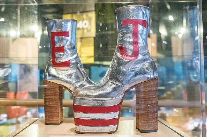 展館中也不少距現代設計感的鞋子,多半都是知名設計師,或是名人穿過的高根鞋。這邊補個腦,高跟鞋可是男人發明的,又或者應該說一開始是男人在穿的,其歷史可以追溯到10世紀,而且是在戰場上和狩獵場騎馬時穿的。比方說著名的路易十四,據說就很喜歡穿「紅底高跟鞋」。上圖兩隻分明有E和J字樣的高跟鞋的便是英國搖滾樂唱作人艾爾頓·強穿過的。