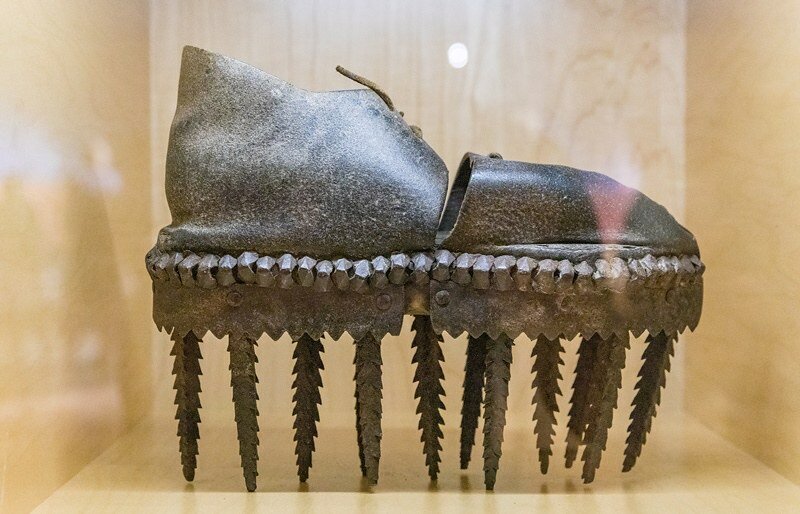 也有可以在冰上走的冰爪鞋,上面是動物皮製作的。