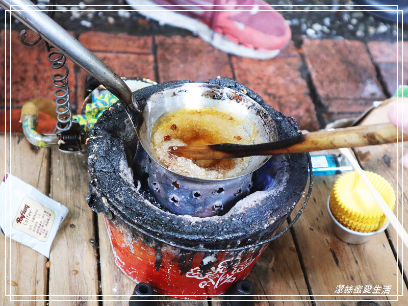 首先在小鐵鍋裡放上紅白糖及水,炭火在底下加熱,再來慢慢攪拌至沸騰。