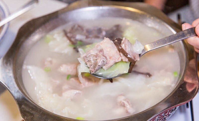這裡的羊肉湯,基本上是承襲藏書的羊肉湯做法,除了羊肉白湯外,高麗菜菜非常的重要,另外也加點木耳配色也添加口感,第一口那是羊肉湯的鮮,半點沒有腥味,即便是鮮還是腥可能關乎每個人對羊肉的喜好程度,但不可否認這家的羊肉白湯算是比較清爽的,最少跟我吃過、喝過的新疆羊肉湯相比是如此。羊肉是帶骨像小排,軟嫩一咬能分開,軟嫩加上吸足鮮甜的羊肉湯非常好吃,就連高麗菜都好好吃,底下還有另外加購的冬粉(個人覺得純喝湯便好,如果你有點其他的主食)。