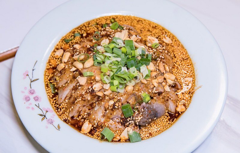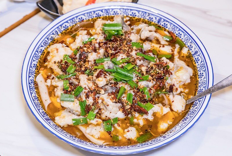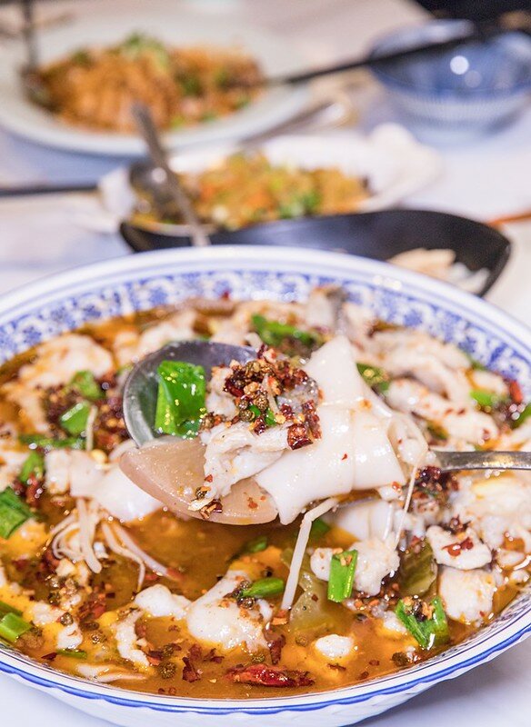 酸菜魚(需預訂)成色比我印象中的深紅許多,但吃上一口卻發現是香而不辣的那種(如果不吃辣的可能會覺得有一點辣),但和口水雞一樣我愛死這家的辣油,油潑也非常的夠味,帶著味覺後端很是討喜的酸度。帶皮的魚肉滑嫩吸足紅湯辣油,好吃的亂七八糟,底下大量的酸菜爽口酸中透甜,口感和味道都很棒。