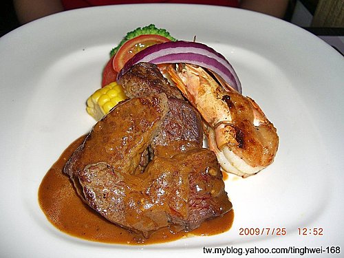 同學點了牛排明蝦餐 NT$480.- + 10% 份量沒有很多 結果同學說她沒吃飽...