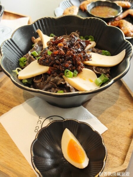 ▲杏鮑菇菇醬茶香麵非常有特色!上層的特製杏鮑菇菇醬與茶香麵均勻攪拌,香氣融在一起很夠味