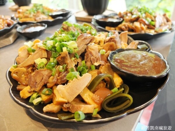 ▲必勝豬腳、女兒粥(豬腳粥)、阿嬤的麻油雞飯、杏鮑菇菇醬茶香麵、花生麻醬肉燥茶香麵、干貝虱目魚粥...等,嘗鮮一整桌豐盛美食