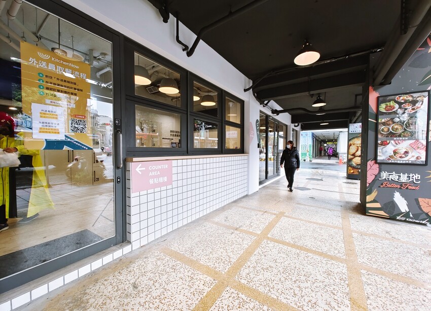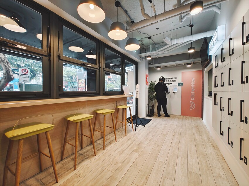 KitchenNow 雲端廚房信義通化店近信義安和站與通化夜市,一樓是外帶、外送的餐點櫃檯(取餐區)與休憩區,出餐的餐點都是從樓上各餐飲品牌店家的廚房製作出來的。