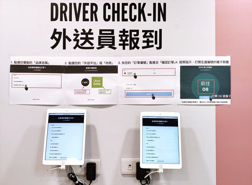 高達三十幾個餐飲品牌在尖峰時段要能讓外送員、訂餐客人流暢的取餐,如何辦到?在 KitchenNow 不會看到店員需要把一袋一袋做好的食物堆放出來等待外送員領取,還得逐一比對,因為這些前置作業都已經經過設計,一切都有自動化流程輔助,外送員到店後,用平板電腦點選「餐廳」->「外送平台」->「訂單編號」->「確認訂單」後,就可以至取餐櫃取餐,因此外送員能用最高效率,取得對應訂單的餐點送到客戶手上。