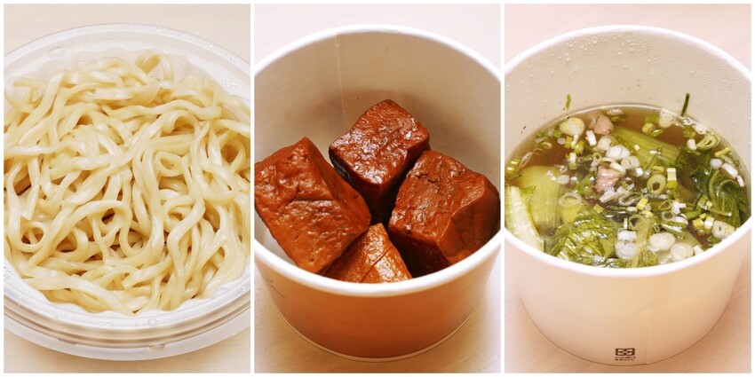 清燉牛肉麵湯頭是用蔬果和牛腱、牛肋條等部位,熬煮長達 12 小時,湯頭內濃縮牛肉脂香、湯頭的輕纖感。牛肉塊的部位是帶有嫩筋的牛腱心與帶有油脂的牛肋條,小火慢燉避免過熟過老,同時保持柔軟細緻的粉色色澤,麵條是台式拉麵,不是一泡就爛的那種,在食材與包材包裝的控管,都能讓消費者把握黃金時間品嘗。