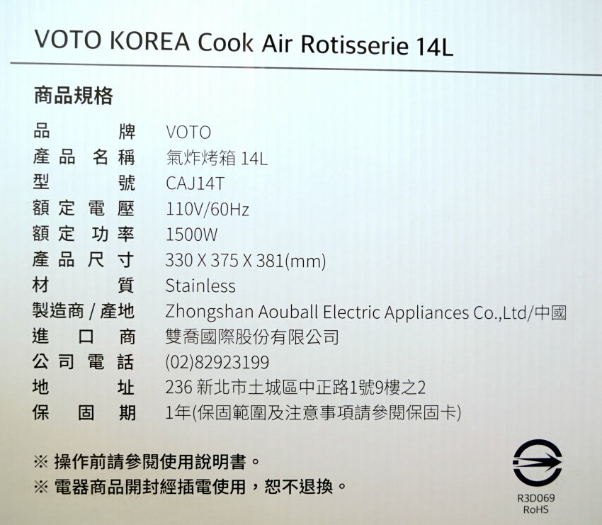 ▼箱側也有詳細的產品規格說明,此外還有一年保固,有任何問題也可以打電話洽詢!