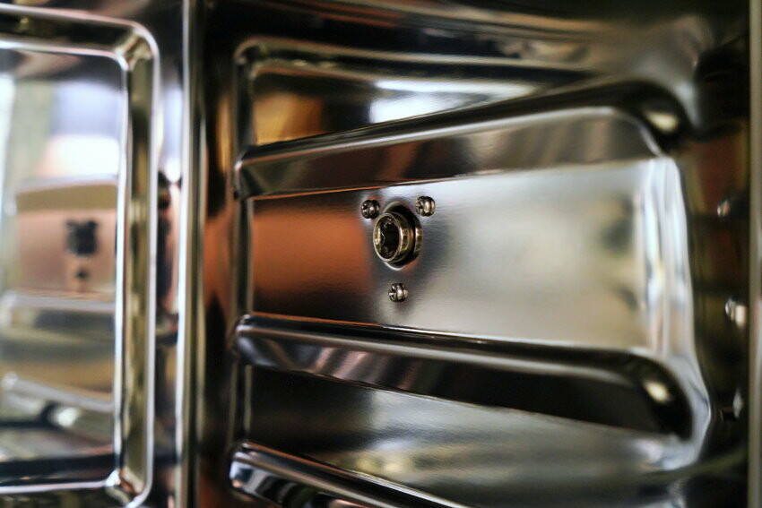 ▼內膽採用不銹鋼設計,簡單好清理! 使用後通常濕抹布差一下即可,如果有烤一些比較會噴油的食材,清潔上烤箱開口大,擦拭也很方便!