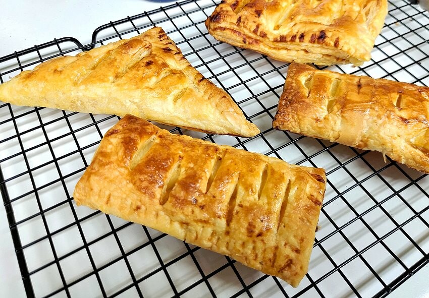 ▼這次我們換個口味,夏天剛好可以改做鳳梨派,只要在酥皮上放入鳳梨果醬、鳳梨切片再對折即可~~如果沒有新鮮鳳梨的話直接放鳳梨罐頭更甜更好吃(笑)!氣炸前記得上頭要先刷上一層蛋液,烤出來顏色才會漂亮!