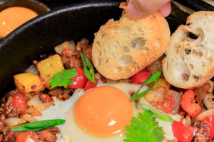 前面有提到鸗和洋串物結合了日式串燒與西式餐酒館的元素,這道北非香料燻肉蛋佐長棍可以說是北非蛋的進化版本,以大量的番茄拌炒彩椒、洋蔥、燻肉與各式豐富的辛香料,中間再打入雞蛋,等待蛋白稍微凝固就能上桌。