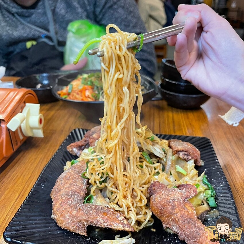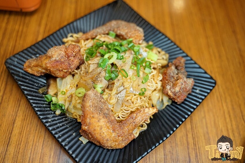 醬爆港式雞翼炒公仔麵(185元),為不吃辣的朋友有推出醬爆系列,是鹹中帶甜很微微微辣的口味,港式炸雞翼皮薄多汁,鹹香鹹香的配飲料啤酒超爽的!