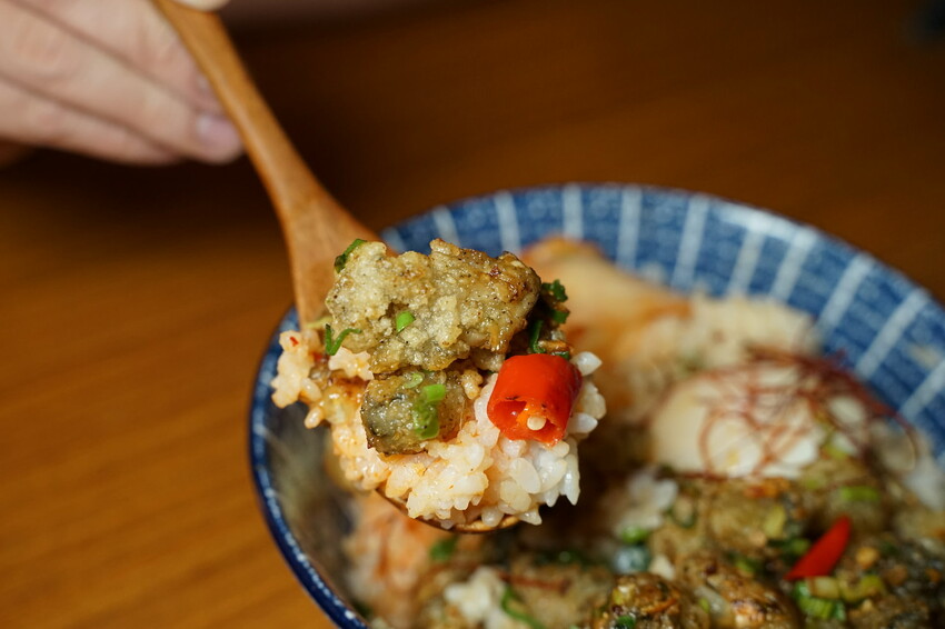 避風塘鮮蚵蓋飯(199元), 蚵仔先炸再炒,將蒜味及辣椒香融入炸蚵,下酒又下飯的黃金組合。