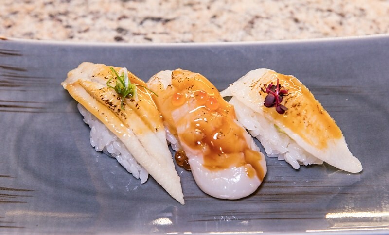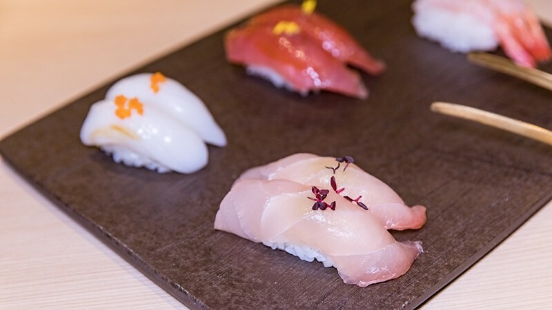 第二區為造身(生魚片)及壽司,除了現點現切的鮭魚、鮪魚、旗魚外,也有一些季節性的鮮魚,比方說稻草燒燻製鰹魚、湯霜手法清燙的長尾濱鯛、風味醬油醋漬鰤魚等,同時備有鹽昆布、紫蘇、薑泥、柚子胡椒等可依客人喜好取用的調味料。