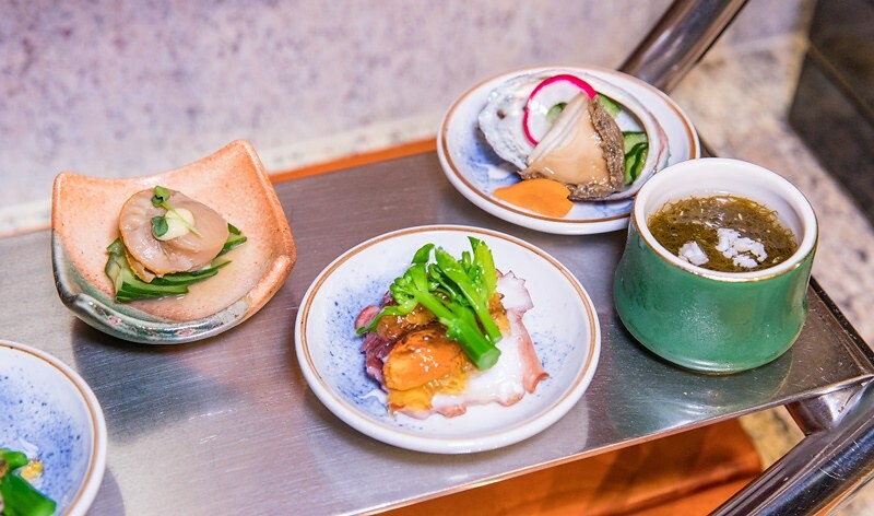 「先付」通常是會席料理的開場,簡單說就是小菜或是前菜,光是這第一關就可以看受到滿滿的誠意,鮑魚款附土佐凍、扇貝芥子味噌、還特別用講究的漆器、餐盤呈現,一整個滿滿日本風。當中的章魚土佐凍非常好吃,一定要記得拿。
