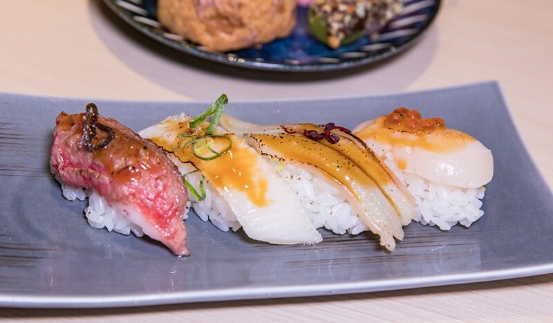 握壽司方面我幾乎都把主力放在炙燒三貫和和牛握,每一種都各吃了兩貫,以吃到飽來說,整片的干貝握真的相當不錯,比目魚雖然油質少了一些,但甜度還可以,和牛握更是讓我連刷了三貫才住嘴,要不是有任務得再嚐其他,我光這一區就可以吃到飽....。