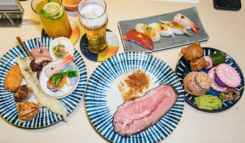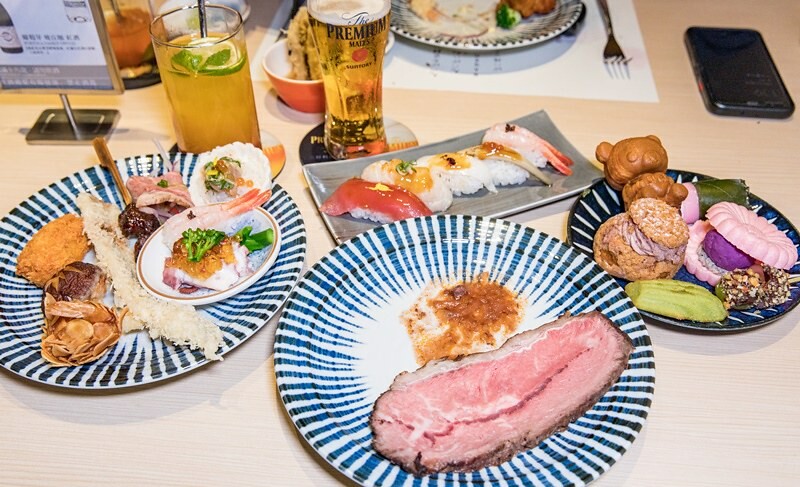 開場前,先跟大家打個預防針,以我小鳥胃的實力,12項近百道我也只嚐了這樣一輪(牛排三片),外加兩次追加的三貫握壽司。當然,還有兩杯三得利生啤及一杯特調的果汁。生魚片、握壽司、天婦羅、烤魚下巴、螃蟹料理、牛排那是必點必搶必嚐,但千千萬萬記得留一點胃空間,好好品嚐個人覺得水準頗高,選項繁多的日式甜點、日式甜點、日式甜點(劃三次重點)。