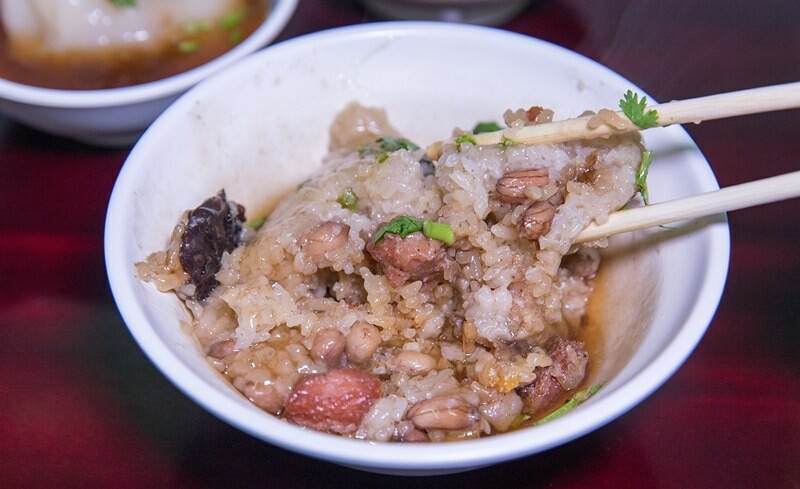 這裡的肉粽比較偏南部粽,和我在屏東吃的好像,看到這模樣好像灑點花生粉.....。綿黏的口感又不至於糊爛,花生非常多、還有香菇、栗子和感覺碎掉的五花肉,和肉圓一樣配著湯湯水水的醬汁,這時真想跑回來拿甜辣醬.....,整體來說算是好吃的南部粽,但也許是甜甜醬汁的關系讓我沒那麼愛。