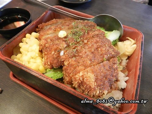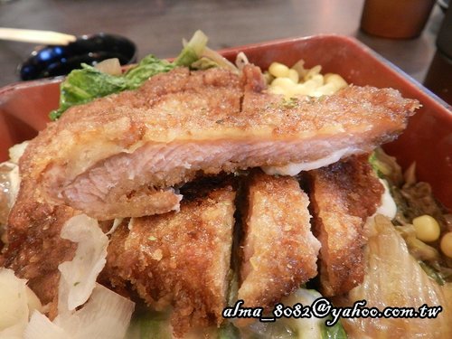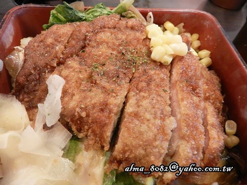 外酥內軟的豬排底下, 鋪滿了玉米粒、白菜丼料、炒青菜,
