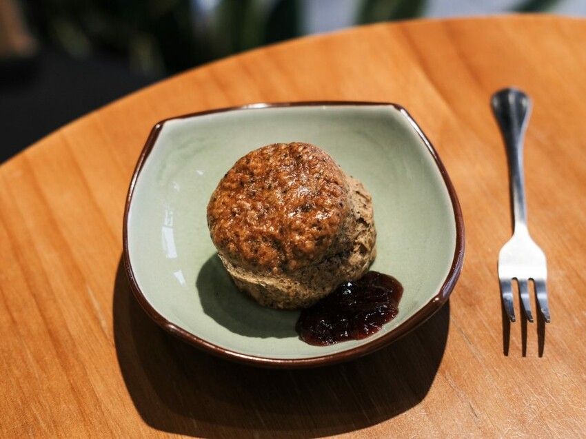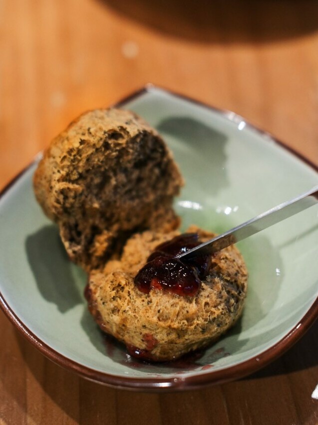 ▼帶有淡淡伯爵香氣的司康,另外附上果醬可以沾取。