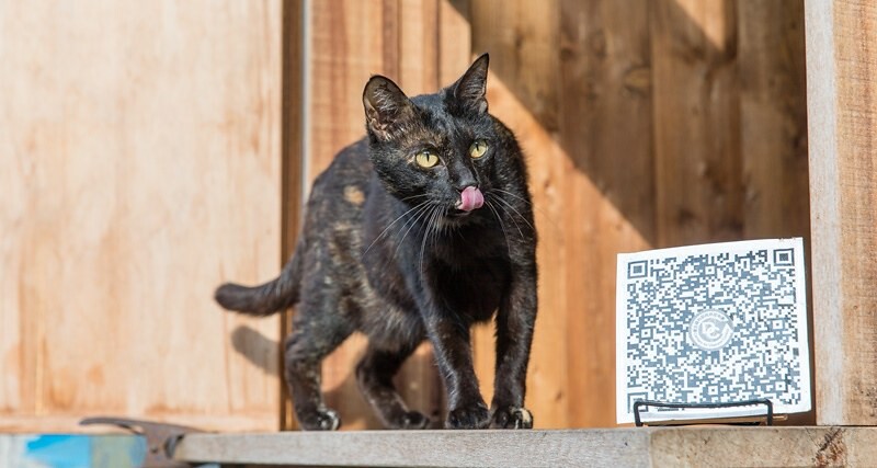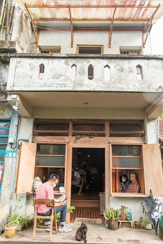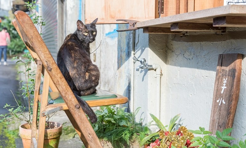 隱約聽到貓咪的叫聲,才發現不知何時,另一邊的男門神已結帳離去(笑),像是吉吉(魔女宅急便)的棕黑貓,不斷對著我的鏡頭眨眼,這時我才發現原來羊水的小木招牌放在地上,加上地上的花草盆栽,這個快門、這個隨意的構圖,我喜歡。