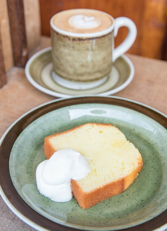 最後貌不驚人的磅蛋糕卻意外的好吃,可能是剛烤過微熱,邊邊角角帶著蛋的焦香,味道根本像鮮奶的鮮奶油同樣微溫,兩者的香氣1+1=4,喜歡到不行,雖然簡單卻讓我不停的輕呼:「好吃得亂七八糟」,就像嶺腳這座小鎮般平凡的討人喜歡。