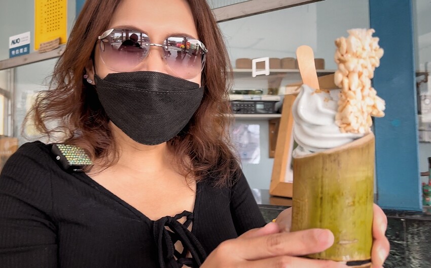 這天來到台西冰菓室,我們點了”桂竹霜淇淋”,有分內用裝以及外帶裝,內用是90元,竹筒不可以帶走,而外帶是100元,桂竹管是可以帶回家作紀念,我們最後選擇的是外帶,想說桂竹管可以帶回家當筆筒。而口味部分每日僅提供一種口味,這天我們品嘗的是海鹽蝶豆花口味,味道還算不錯挺濃郁,但因為天氣熱,所以很快就會融化。