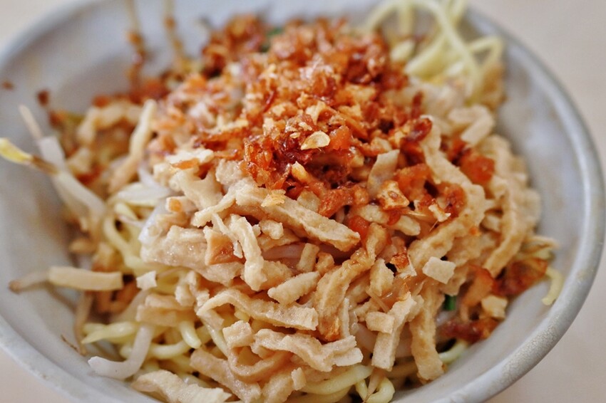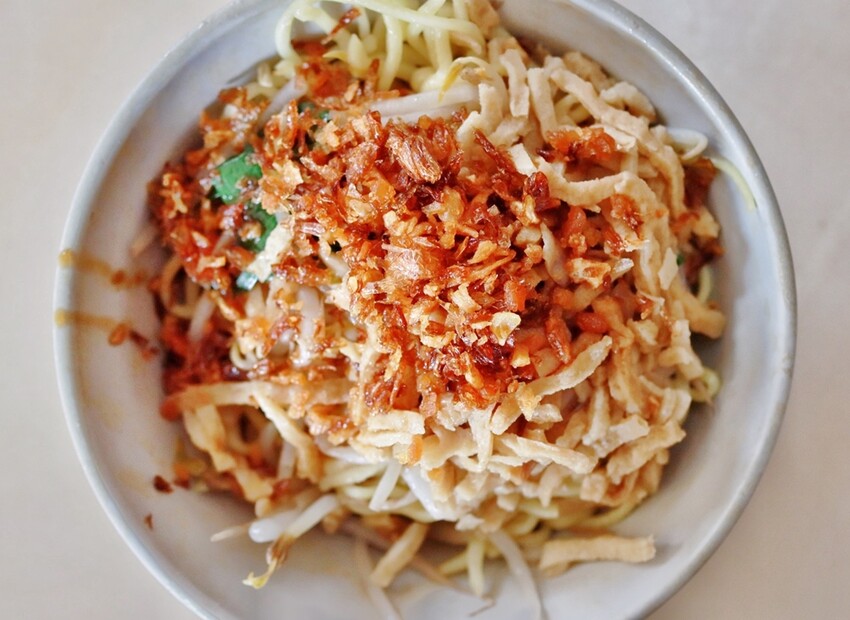 這天點了一碗小碗的黃麵(30元)以及一碗加蛋的滷肉飯(45元),真心的喜歡他們家的滷肉飯,滷肉飯比較偏南部的滷肉飯,有著鹹甜鹹甜的好滋味,滷肉是切成一塊塊的豬肉連皮跟瘦肉一起下去滷,吃在嘴裡層次感非常足夠且還加了酸菜下去解膩,不免讓人一口接著一口吃光光;黃麵(乾麵)的話一定要加點辣增添它的味道喔!