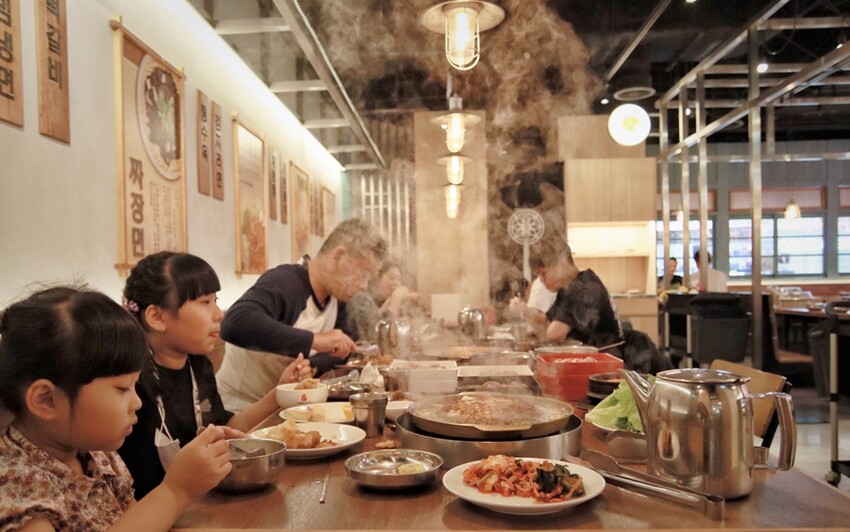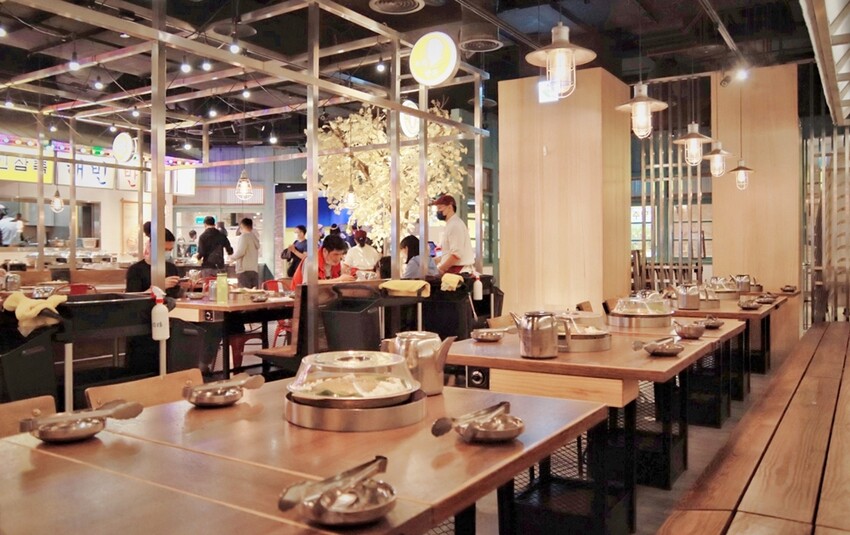而高麗園銅板烤肉-大江店的座位區算屬簡約不失單調工業風,用餐座位區大多為2~4人座,多人用餐人也會安排在相鄰的座位區,走道滿寬敞的,所以取餐動線不太會讓人覺得擁擠!但這天來用餐的地板很油很滑,大夥在取餐時都會特別注意避免自己滑倒。