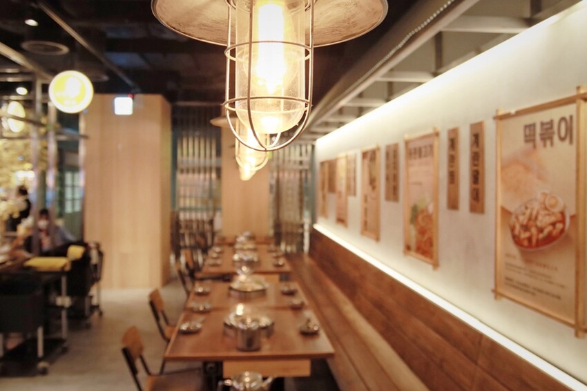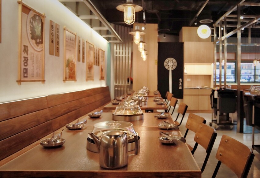 高麗園銅板烤肉-大江店的裝潢設計十分韓風,讓人會有在韓國餐廳吃飯的感覺,而櫃檯的設計也很像街頭小吃攤;進入餐廳的右手邊主要是自助吧的取餐區,左手邊及中間區域則為用餐區。