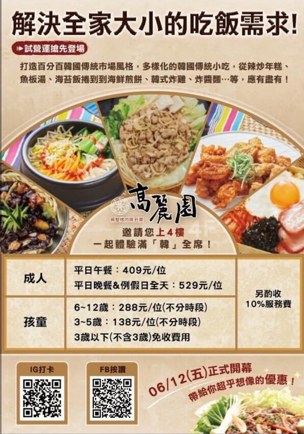 吃到飽的高麗園銅板烤肉,用餐時間為90分鐘,所有餐點都是無限吃喝,平日午餐收費為458元,晚餐及假日收費皆為588元,但3歲以下幼童是不收費;3~5歲的孩童則收138元;6~12兒童則收318元,以上費用皆須加收10%的清潔費。除了自助吧餐點可以自行夾取物,每桌會附上一張QR CODE,拿出手機掃描後就可以進入點餐!