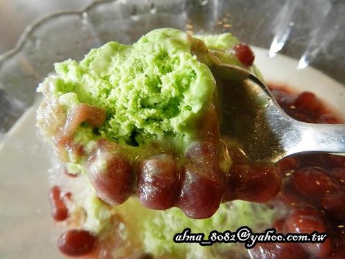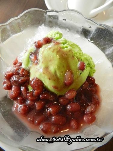 碎冰上面放上一顆抹茶冰淇淋, 旁邊放了不少蜜紅豆喔!
