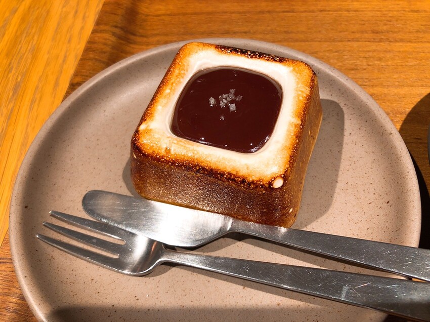 S’MORE中間巧克力部份是帶點微苦的甘納許,表面撒上少許岩鹽,被烤到呈現金黃色外表的部分其實是棉花糖!切開後發現最底下還有一片威化餅乾。烤過後香噴噴又甜滋滋的棉花糖配上甘納許的苦,以及一點點的鹹,多重滋味在嘴裡配合的剛剛好。