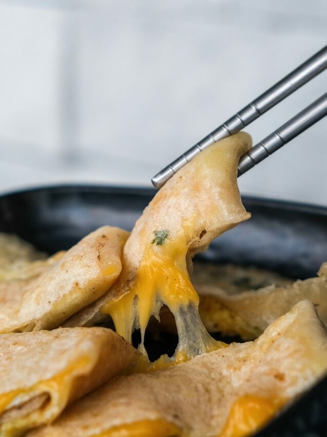 ▼薄薄蛋餅皮中塞滿起司餡料,拿起時還有浮誇的牽絲效果,熱熱吃能感受到起司濃郁感~