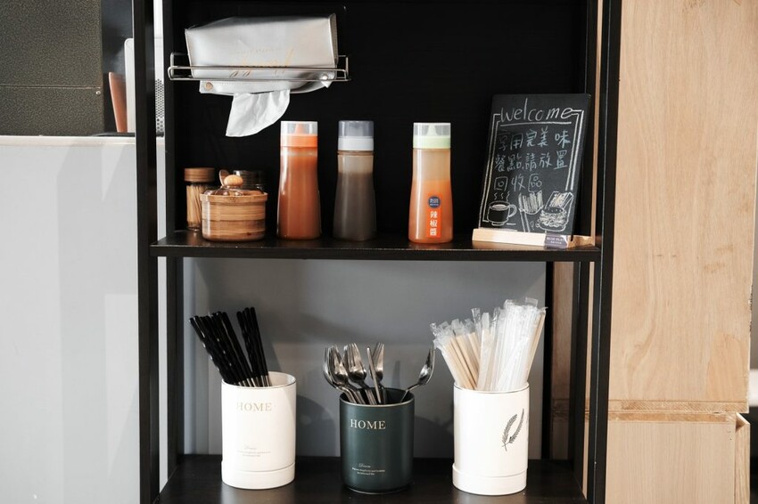 ▼店內裝潢是具現代感的俐落風格,灰色牆面以英文字體及畫作點綴,搭配乾淨整潔的白色木頭風桌椅,跟家裡巷口的街邊早餐店相比,整體環境充滿質感及高舒適度。