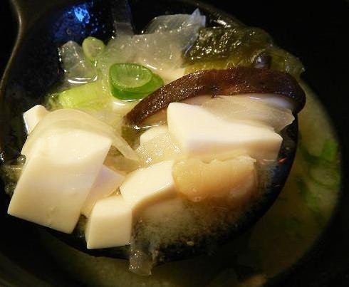 味增湯有豆腐、香菇、魚肉, 雖然只是小小一碗但是所有精華都有了,