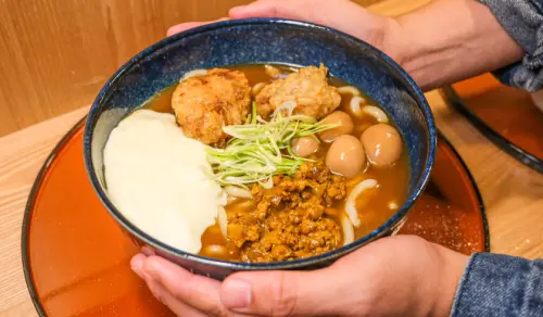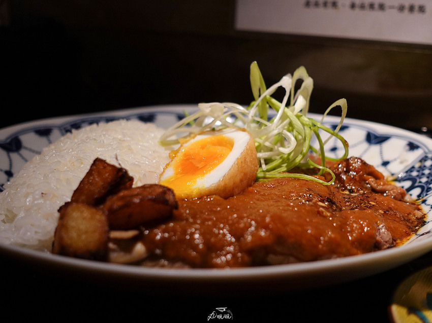 咖哩飯的部分,與熟成咖裡醬汁搭配的是月光白米飯,並附上炸的溏心蛋、馬鈴薯塊、蒜苗絲和生洋蔥丁。