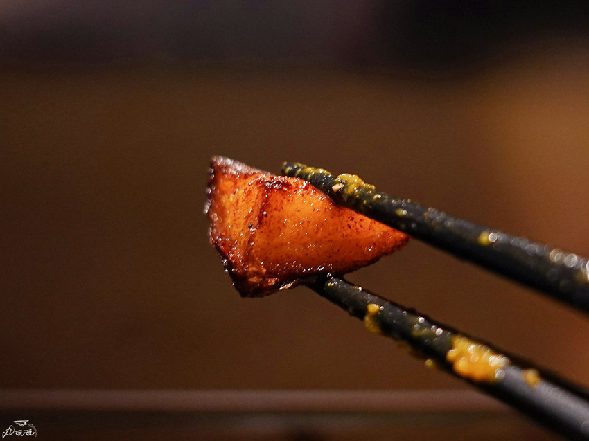這天搭配的小菜是柚香醃白蘿蔔,看著片得極薄透的白蘿蔔,極佳的脆口度帶著微酸的柚香,清爽開胃又解膩,是目前吃過這麼多醃白蘿蔔小菜中,最讓我印象深刻的!